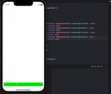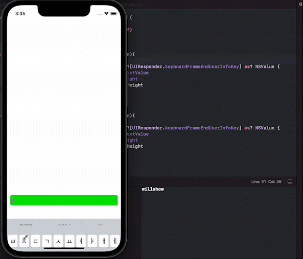 이제 이 willshow와 willhide함수를 사용하여 키보드의 크기를 계산하여 TextField의 constraint를 수정해주는 코드를 추가해주면 된다.