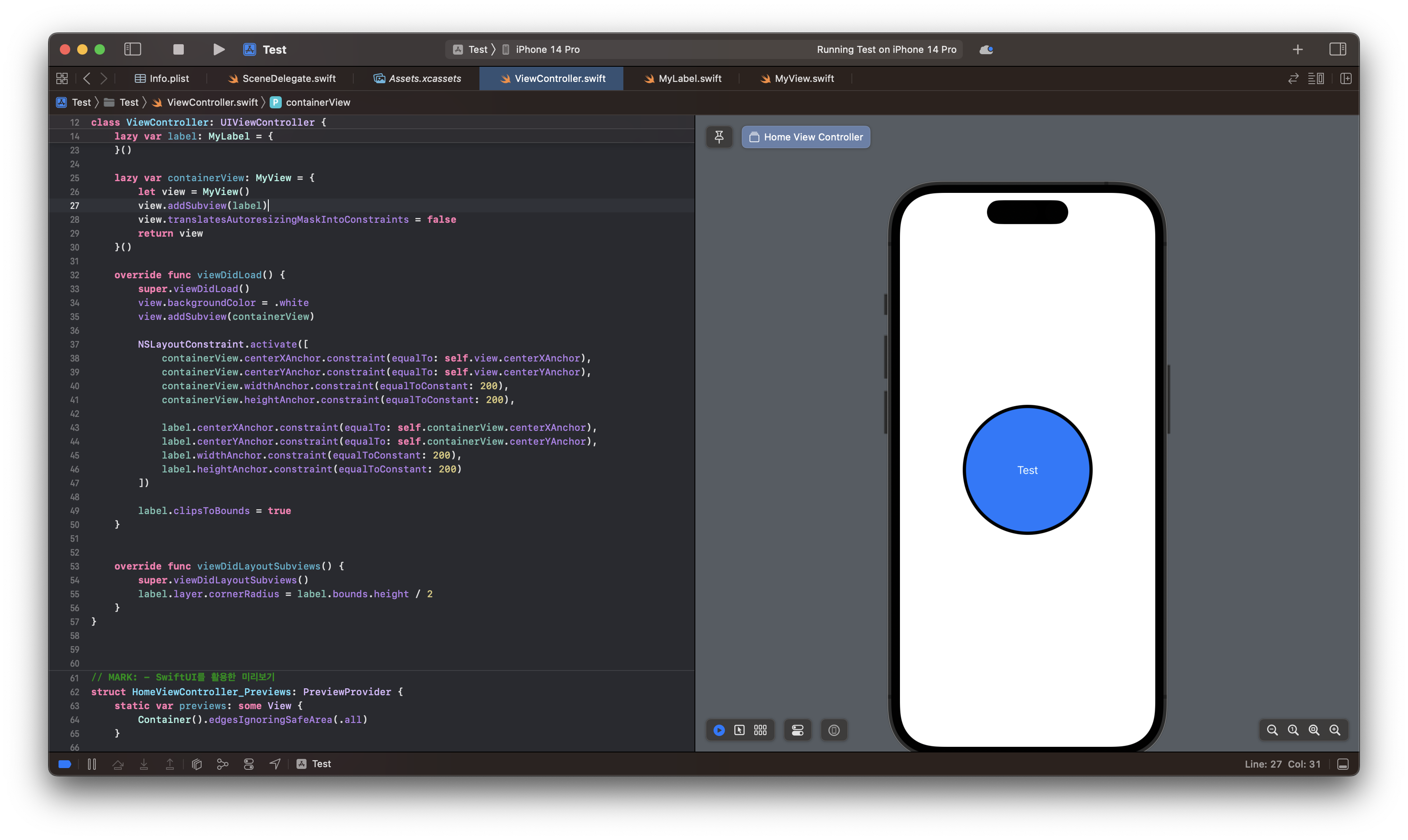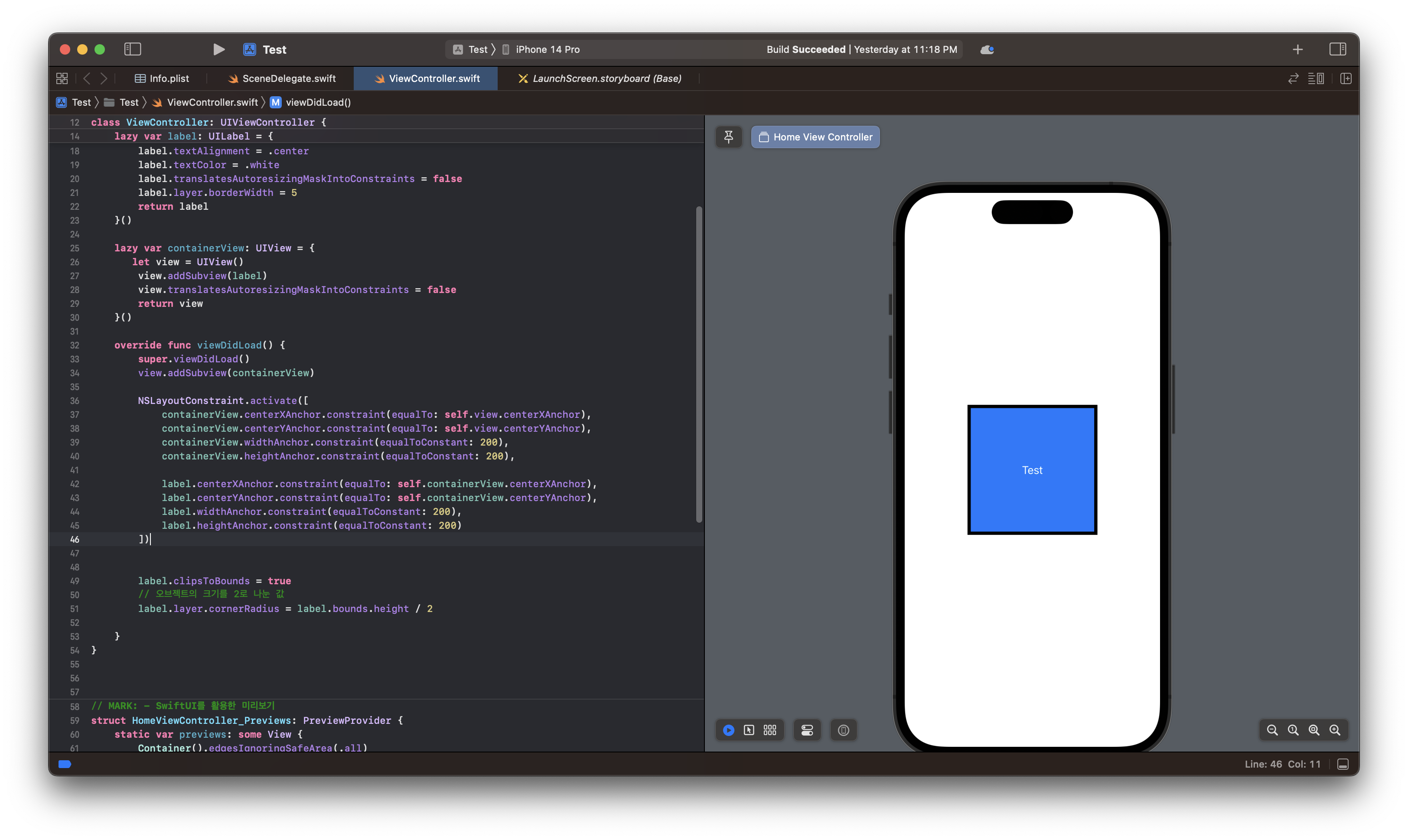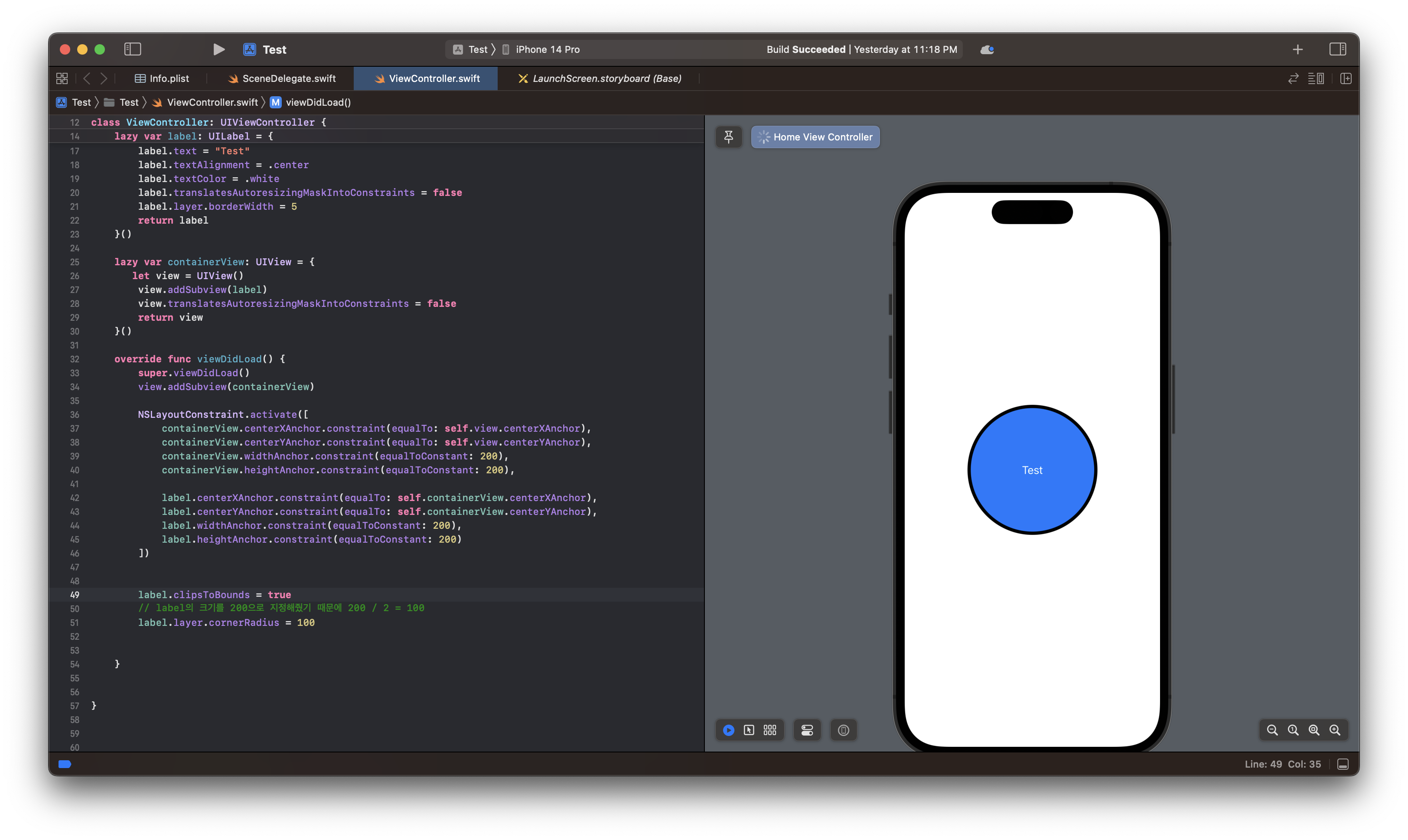 그러므로 오브젝트의 높이가 결정되고 난 뒤에 불리는 함수 viewDidLayoutSubViews()에서 cornerRadius 값을 주면 된다.