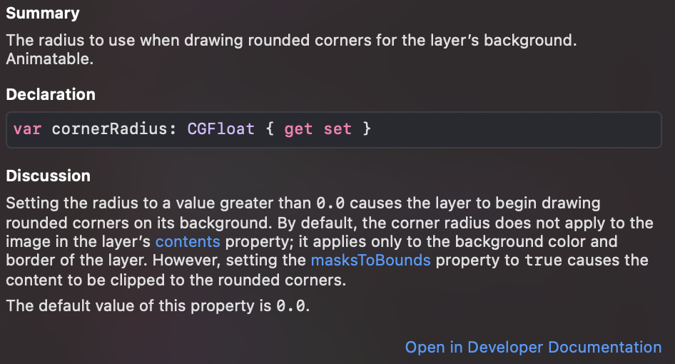 cornerRadius의 Summary를 보면 CGFloat 타입이며 디폴트 값은 0인것을 확인할 수 있다.