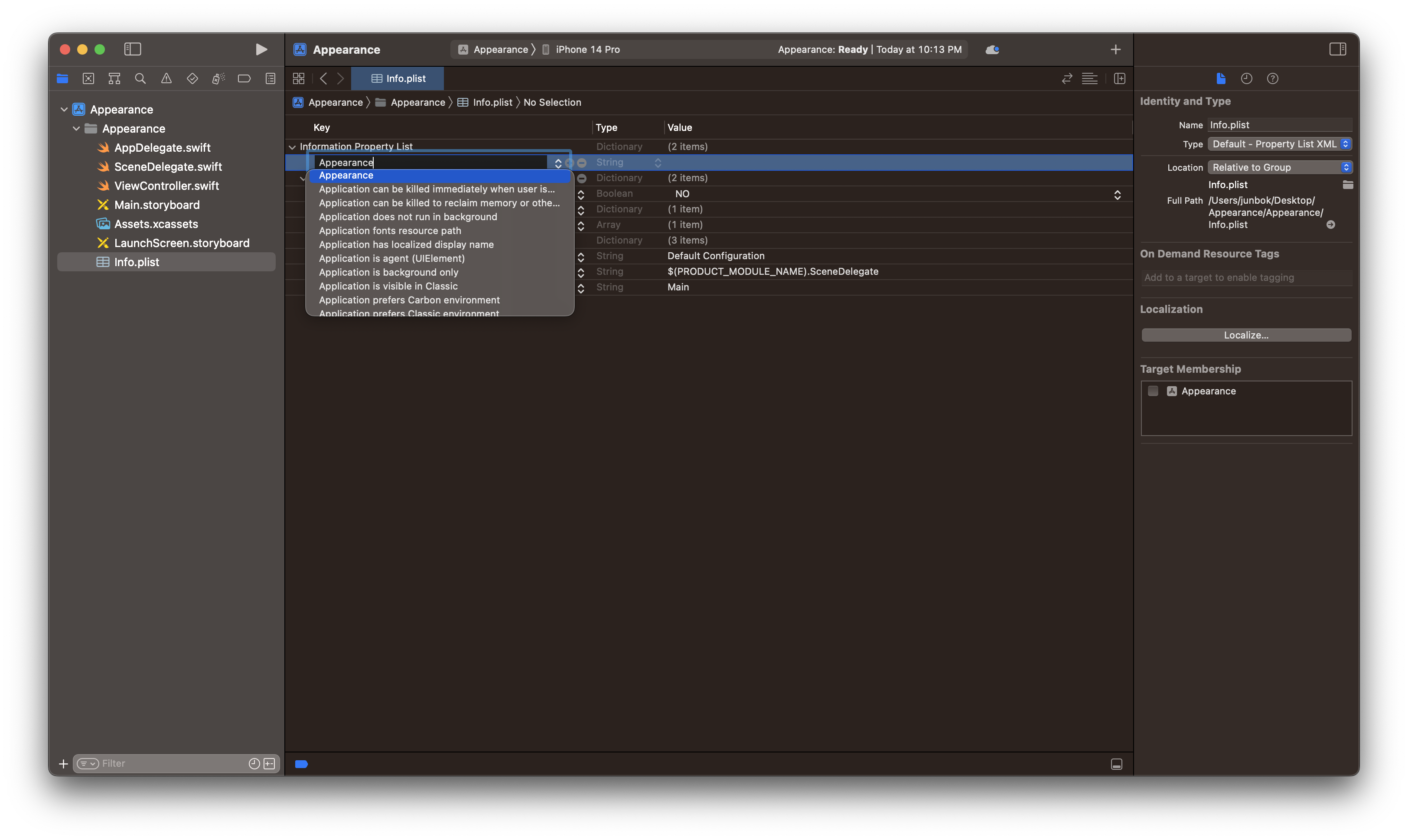 info.plist에서 프로퍼티를 추가하면 앱을 실행할때 LightMode 또는 DarkMode로 강제할 수 있다.