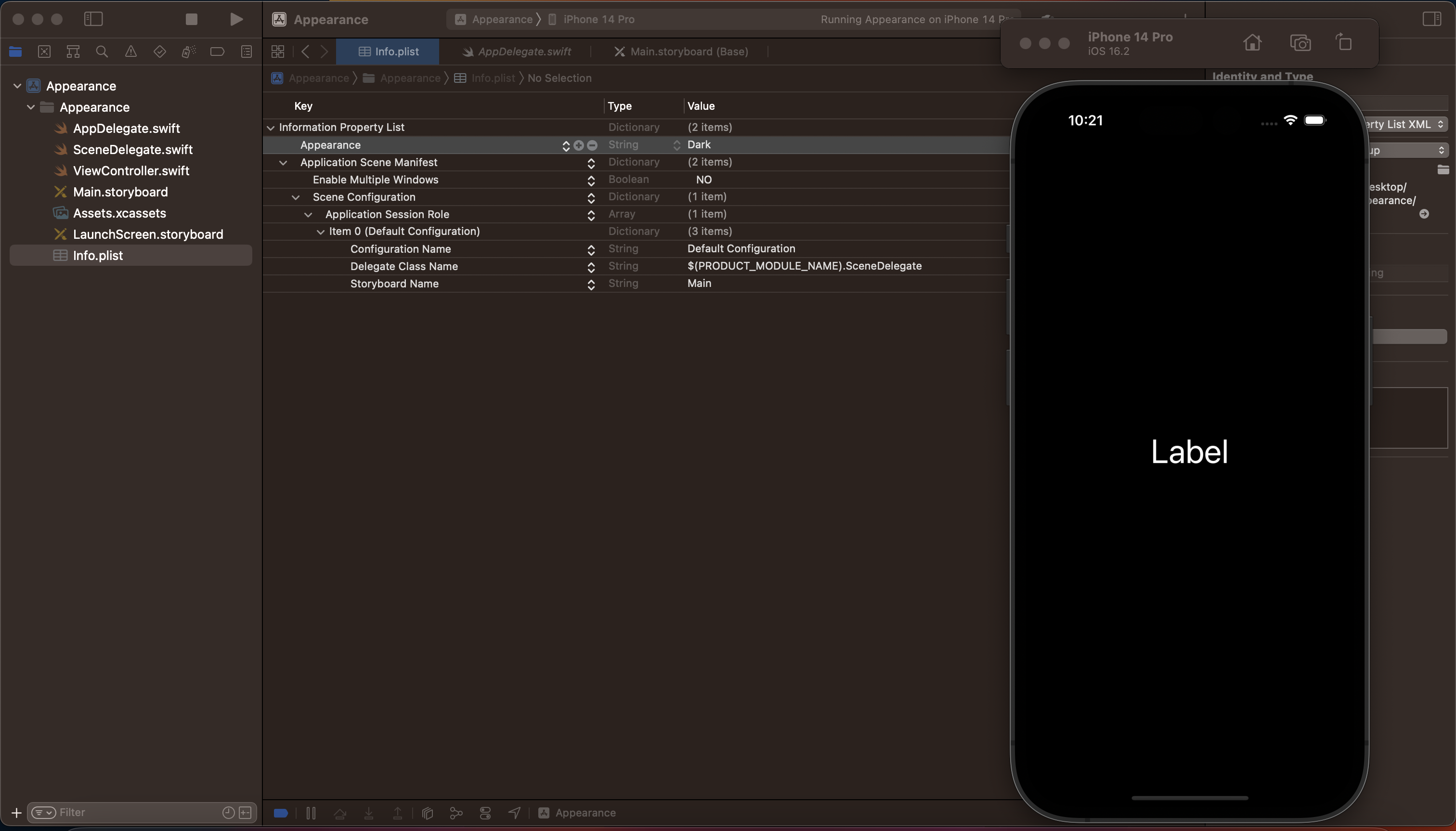info.plist에서 설정을 하면 디바이스가 다크모드여부에 상관없이 info.plist에서 설정한 값으로 앱을 실행한다.