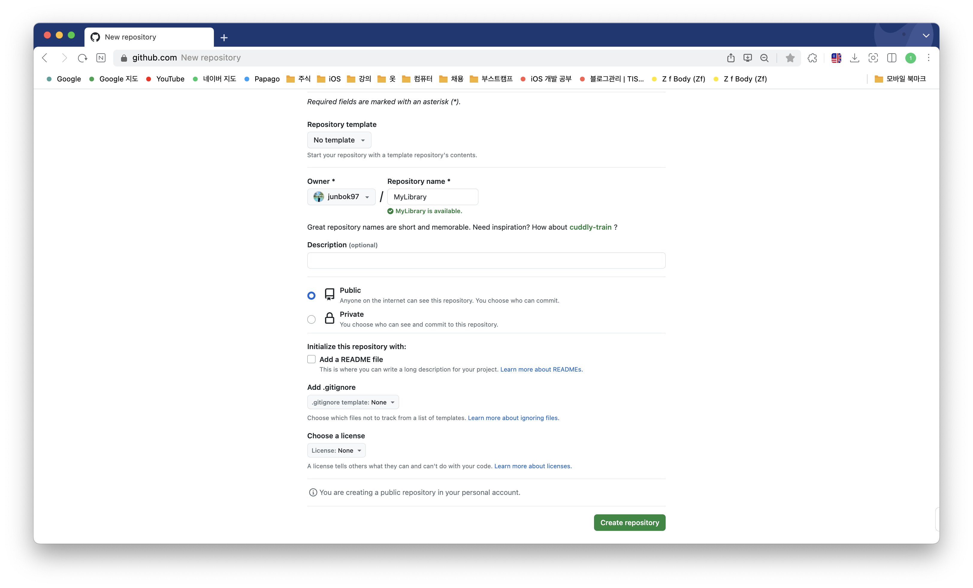 readme를 추가하지 않고 gitIgnore과 license모두 none으로 선택하고 레포를 만든뒤