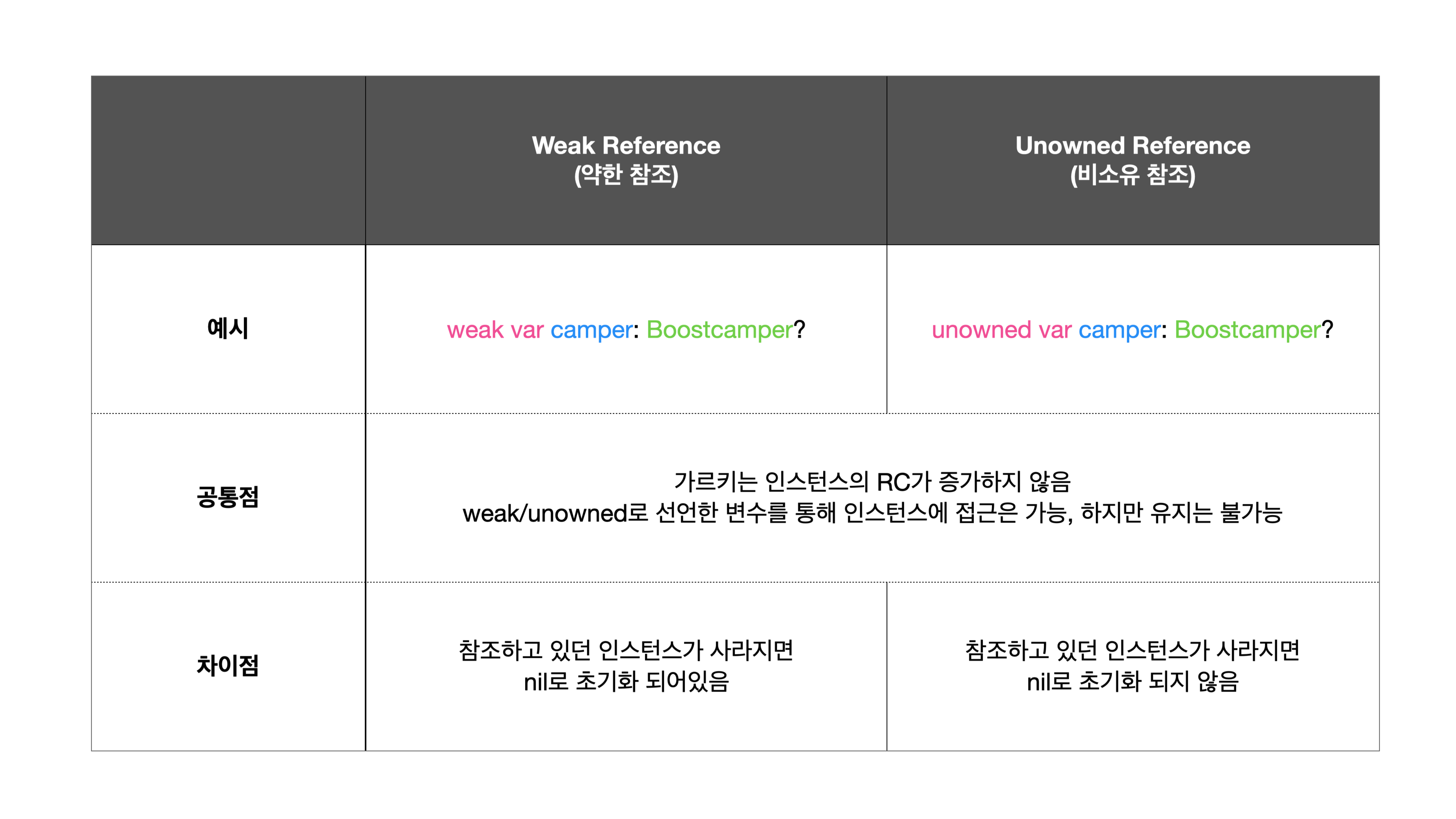 - 참조하고 있던 인스턴스가 해제되면 nil을 자동 할당