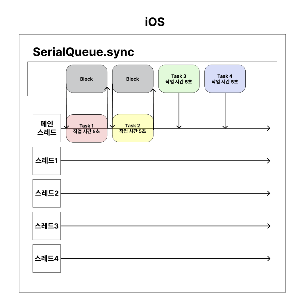 - 메인 스레드의 작업흐름이 큐에 넘긴 작업이 끝날 때까지 멈춰(sync)있다