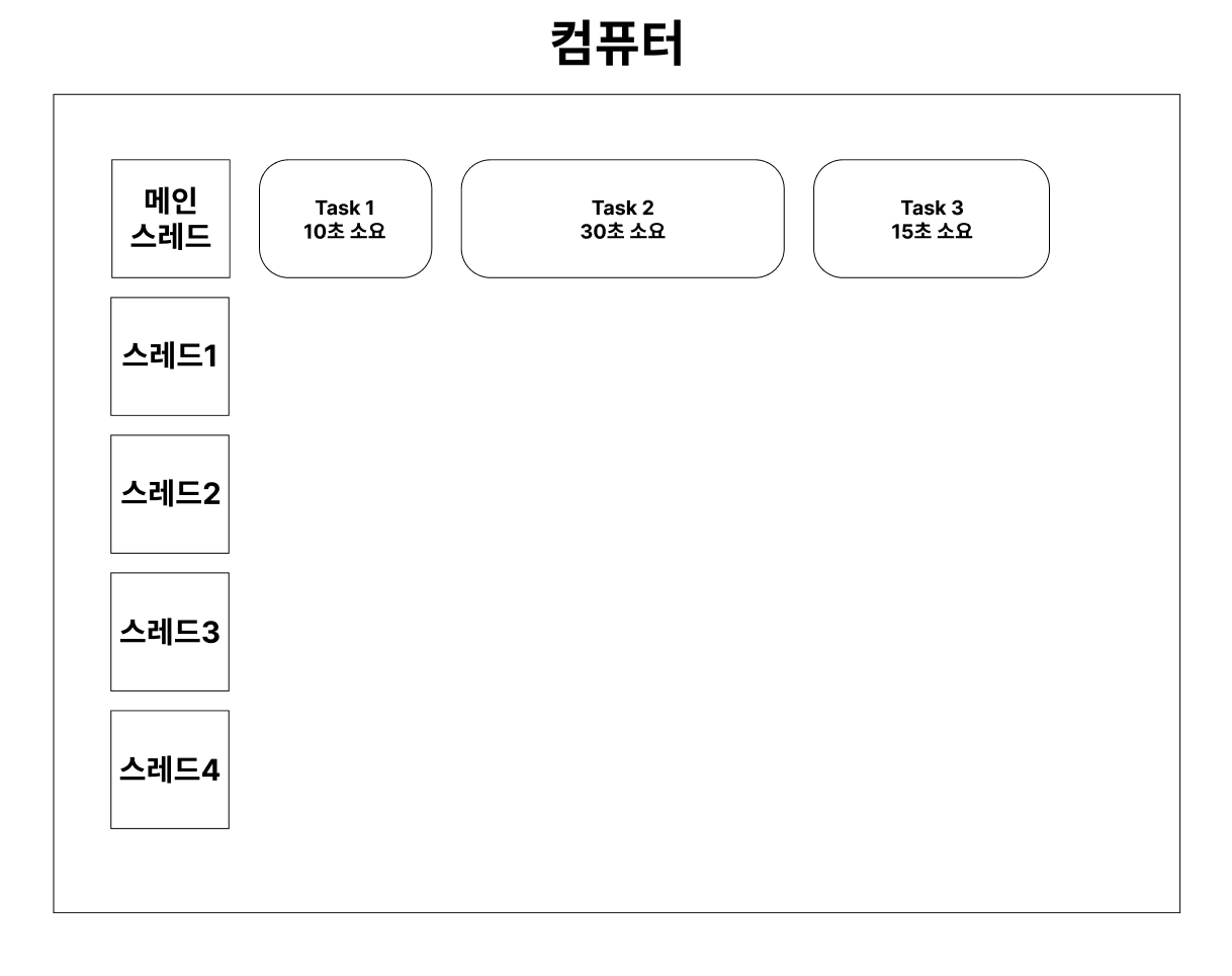 Task1은 스레드1에서 실행되고 메인스레드는 아무것도 하지 않고 있지만 메인 스레드는 스레드1이 Task1을 다 끝내는 10초동안 대기하고 있어야 한다. 결국 메인스레드에서 Task1을 실행하는것과 다르지 않게 된다.