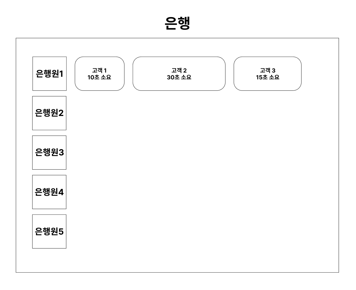하지만 옆에 있는 은행원들 에게 고객을 분산시켜주면 아주 빠르게 고객들의 업무를 볼 수 있다.