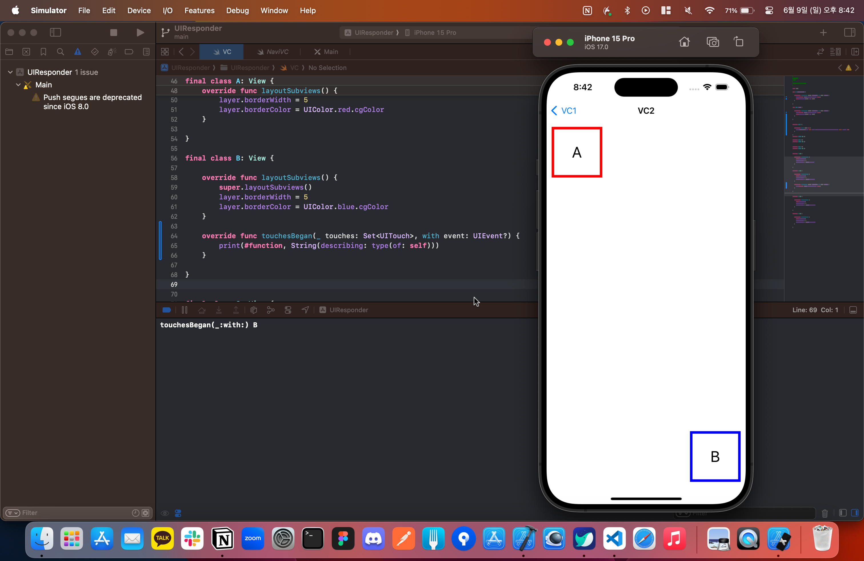 - 다음 responder는 app delegate지만 app delegate는 UIResponder의 instance여야 하고 UIView, UIViewController, 그리고 app object 자체가 아니여야 함(UIApplication을 말하는 듯)