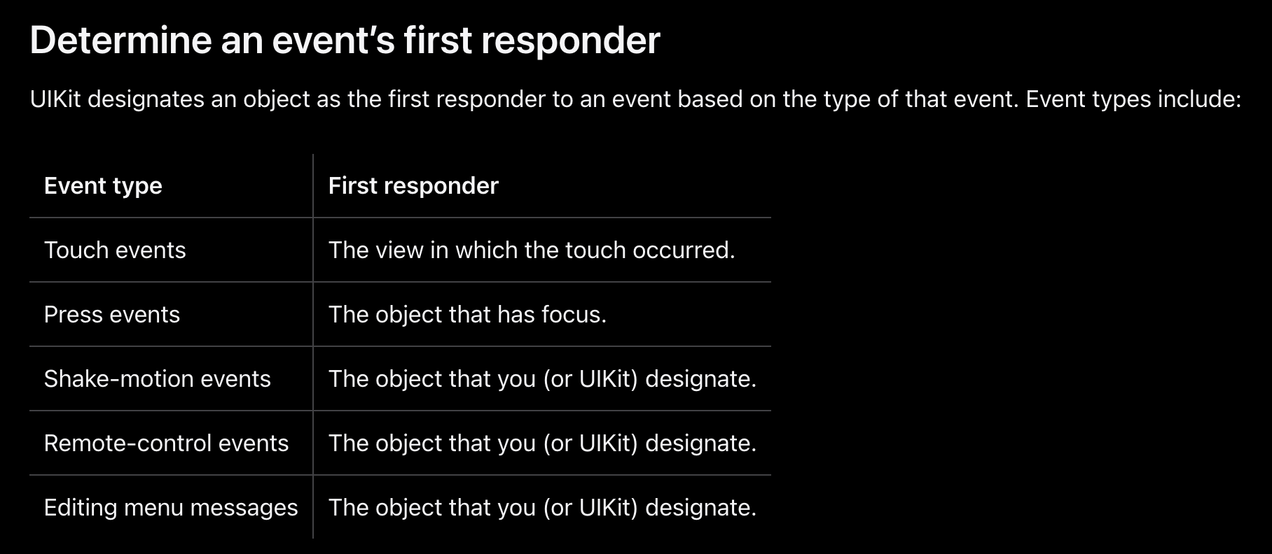 UIKit은 발생한 event type(UIEvent.EventType)을 기준으로 First Responder를 결정