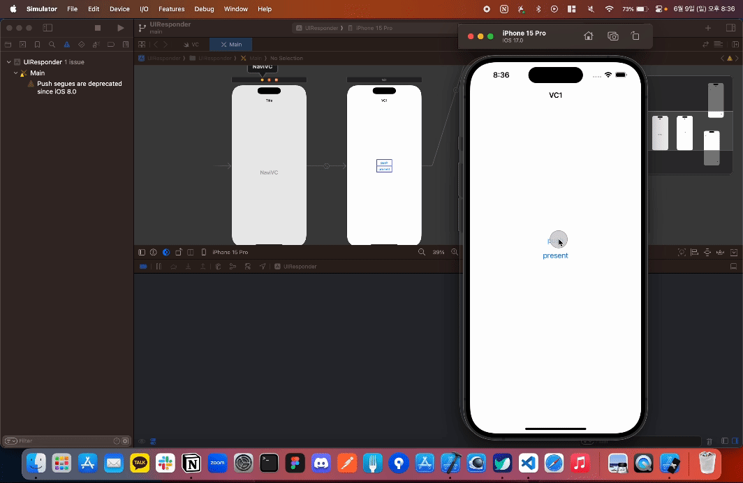 - 만약 viewController가 다른 viewController에 의해 present된 것이라면 다음 responder는 present한 viewController