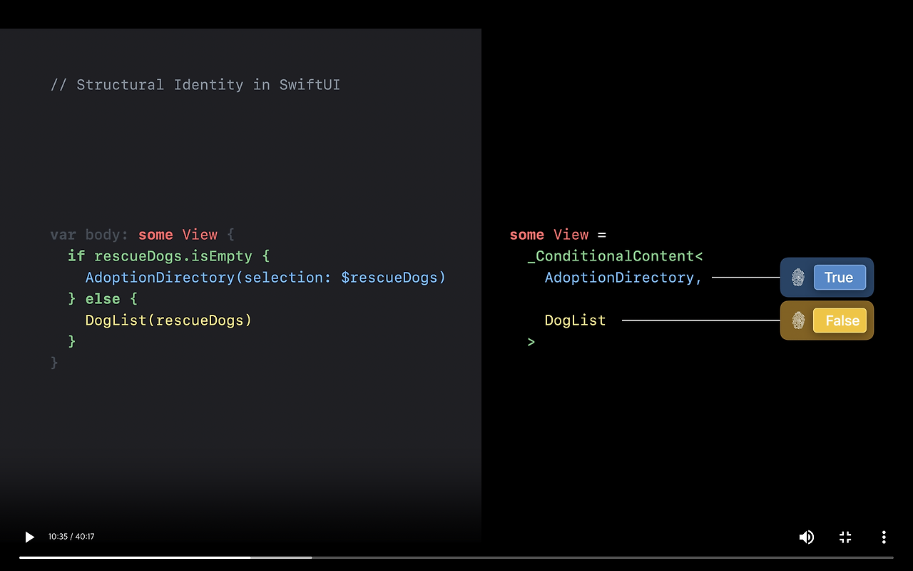 SwiftUI는 API 전반에서 Structural Identity 를 사용하는데 대표적인 예는 View 코드 내의 if문 처럼 조건부 로직을 사용하는 경우